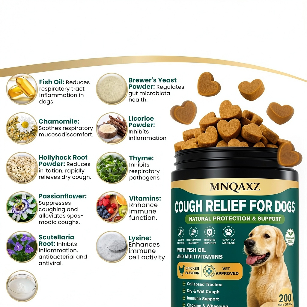 Our dog coughing treatment chewable tablets are expertly formulated to address respiratory discomfort in dogs. These tablets feature a natural herbal blend including marshmallow root for quick cough relief, primrose to clear phlegm, chamomile for gentle soothing, and fish oil to reduce inflammation. Designed with a chicken flavor that dogs find irresistible, they replace traditional liquids or tablets, making administration hassle-free. The product measures 5.59 x 3.86 x 3.78 inches and weighs 1.15 pounds, ensuring convenient storage and handling. Manufactured by SHANDONG ZHENTA, these tablets adhere to high-quality standards, free from chemicals and artificial additives, providing safe and effective care for your pet.