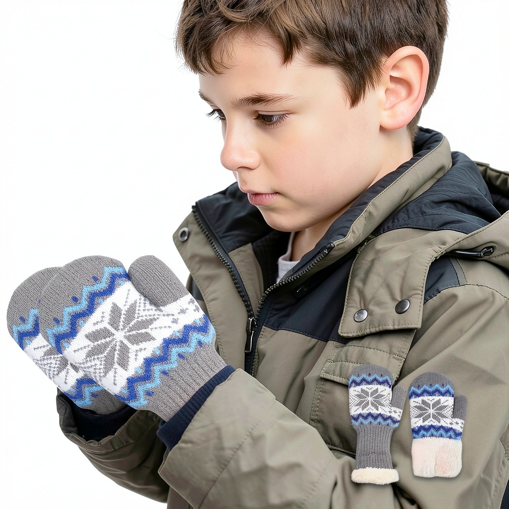 These classic mittens are designed for children aged 3-7, featuring a thumbs-up design for added flexibility and ease of movement. Crafted from high-quality knit materials with a soft, cozy fleece lining, they provide exceptional warmth and comfort in cold conditions. The mittens are unisex, making them suitable for both boys and girls, and include a flexible wrist part that ensures a snug, secure fit to prevent slipping during active play. Key specifications include a soft fleece interior, durable exterior knit, and a design optimized for ages 3-7, with dimensions tailored for small hands. Available in a grey color option, they are lightweight and easy to wear, promoting all-day comfort without restricting movement.